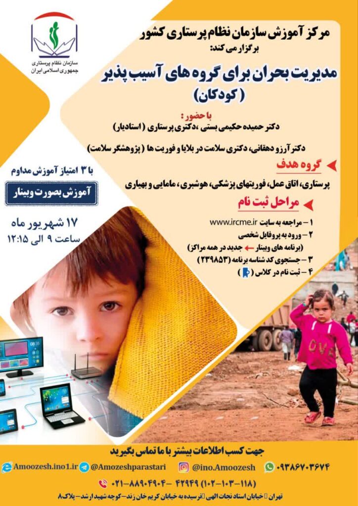 وبینار مدیریت بحران برای گروه های آسیب پذیر ( کودکان) به همت مرکز آموزش سازمان نظام پرستاری کشور در تاریخ 17 شهریور ماه برگزار شد.